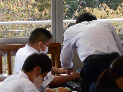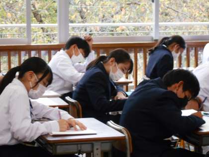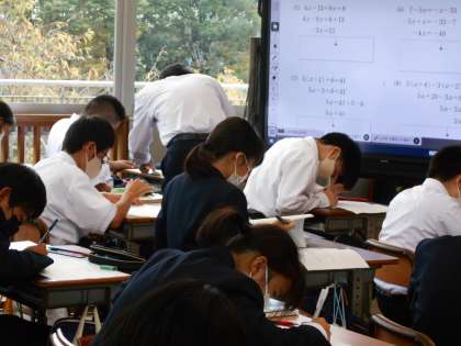 1年生の数学の授業は、割合に関する問題への取組。皆真剣に取り組んでいました。