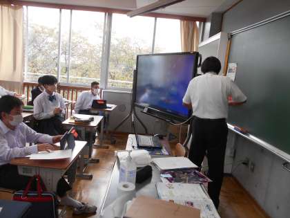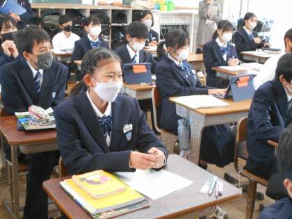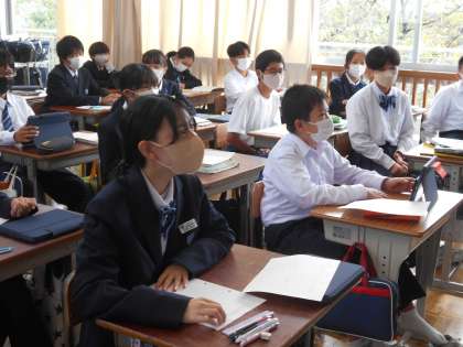 1年生の英語の授業は、人物を紹介する英文作り。先生の説明を真剣に聞いていました。