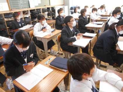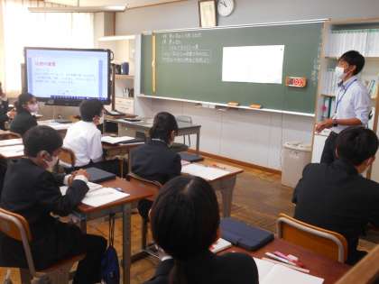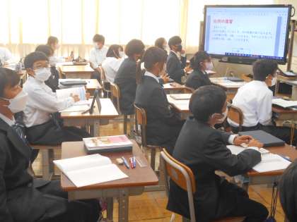 1年生の数学の授業は、量の変化と比例、反比例について。先生の説明を真剣に聞いていました。