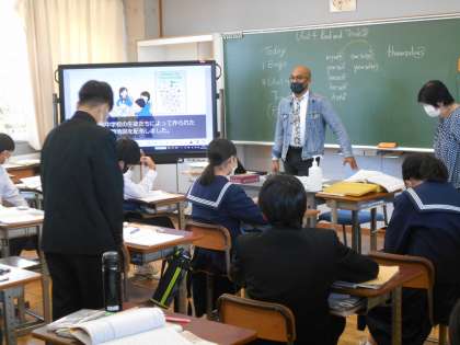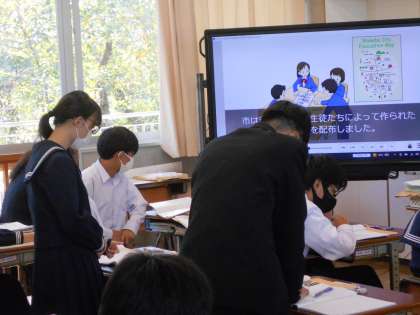 3年生の英語の授業。会話文の練習を真剣に行っていました。