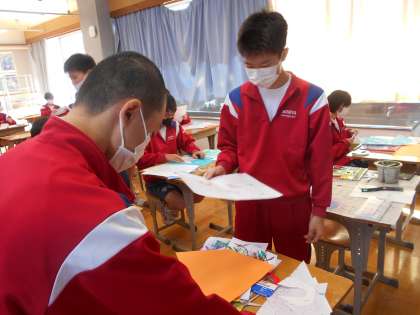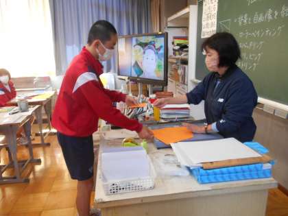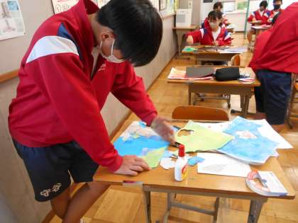 3年生の美術の授業は、自画像の背景づくり。皆真剣に考えていました。