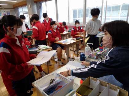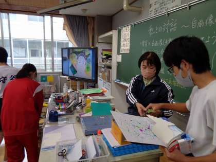 3年生の美術の授業は、自画像の背景づくり。皆工夫をこらしながら仕上げていました。