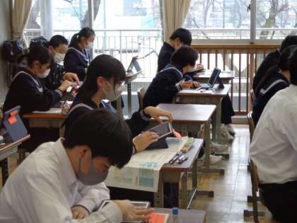 3年生の社会の授業は、国際社会について。タブレットで調べ、確認していました。