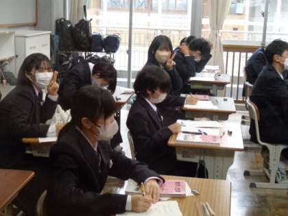 1年生の数学の授業は、空間にある図形について。先生の解説を真剣に聞いていました。