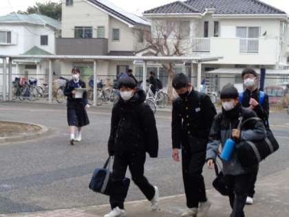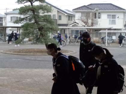小雪の中、生徒が元気に登校してきました。今日も頑張りましょう!