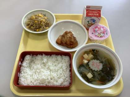 今日の給食は「ごはん、牛乳、鶏肉のレモン煮、ごぼうサラダ、お祝い中華スープ、お祝いいちごゼリー」です。