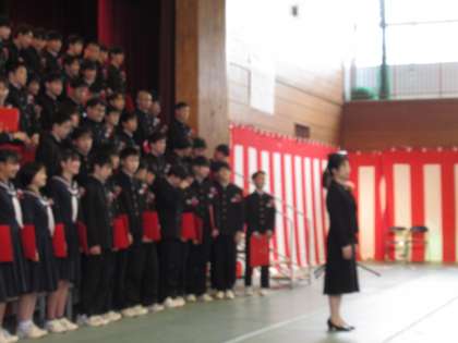 保護者の皆様、先生方からのあたたかい拍手に包まれながら、清々しい表情で卒業生が退場します。中学校生活の思い出、一つ一つをかみしめながら、体育館を後にしました。御卒業、おめでとうございます。