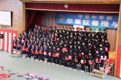 卒業生の皆さん、さようなら。皆さんは、私の、そして、守谷中学校の誇りです。私は皆さんと出会えることができて、とっても幸せでした。 この、伝統の守谷中学校卒業生となる皆さんの前途に開ける未来に、そして、これから始まる新しい時代での御活躍に、期待と思いを馳せながら式辞といたします。