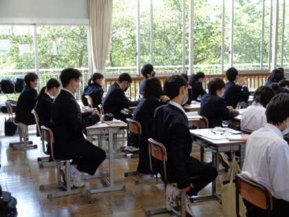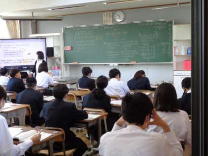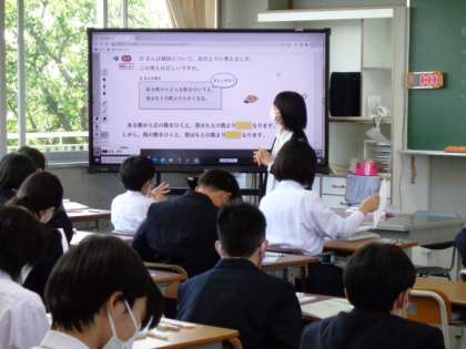 1年生の数学の授業は、加法と減法の混ざった式について。先生の説明を真剣に聞いていました。