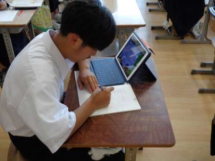 2年生の社会の授業は、江戸幕府について。電子黒板とタブレットを用いて確認していました。