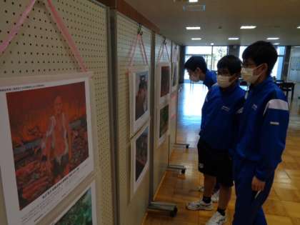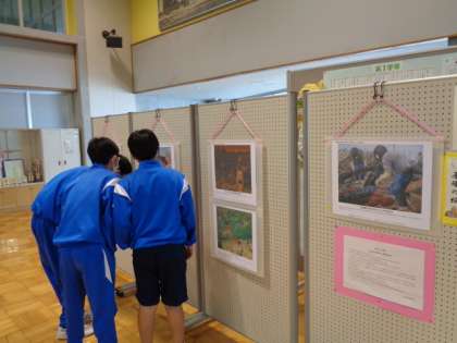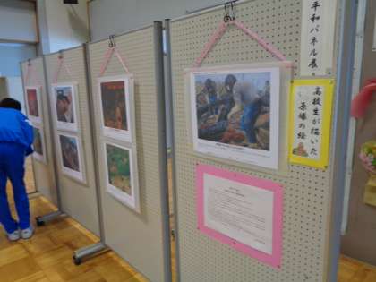 コミュニティホールに、守谷平和の会さんからお借りした、『高校生が描いた原爆の絵』を展示しています。戦争の悲惨さが伝わる作品ばかりです。この絵は、今後3年生の授業でも取り上げていきます。平和について、一人一人がしっかりと考える機会になればと思います。