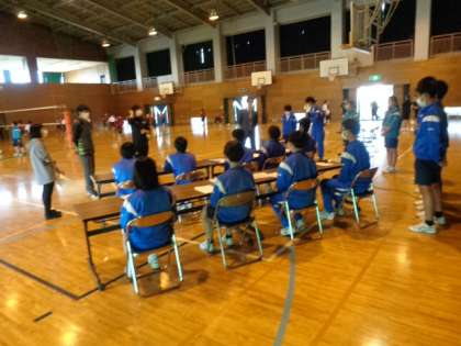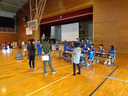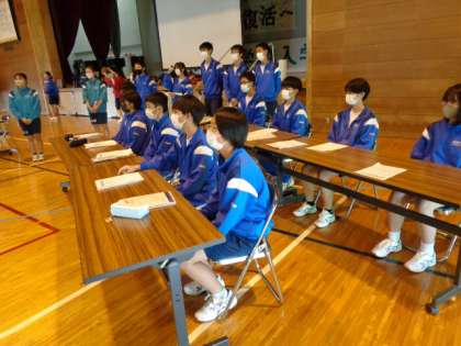 放課後、体育館で明日行われる生徒総会のリハーサルを行いました。皆真剣な態度で確認していました。