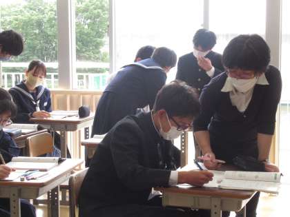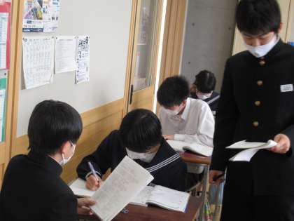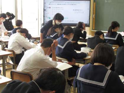 式の展開について学んでいます。様々な難易度の問題に取り組み、どのように解いたのかについて友達と確認しています。