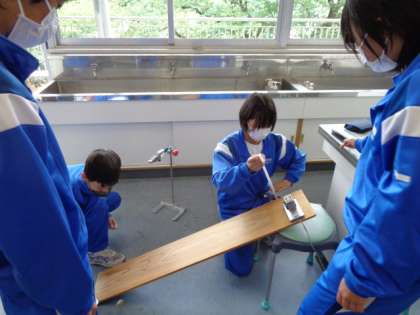 3年生の理科の授業は、物体の運動について。斜面を落ちる台車の運動を調べていきます。