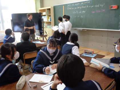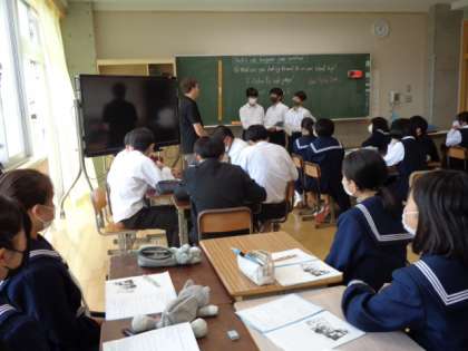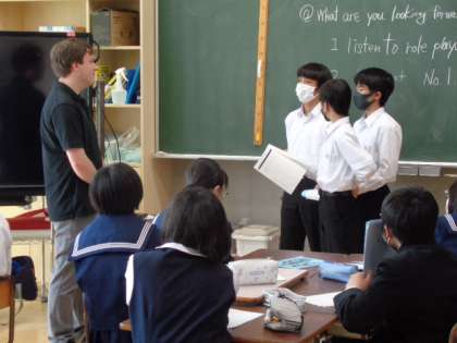 3年生の英語の授業は会話文。修学旅行における折り鶴プロジェクトでの会話の練習をしていました。