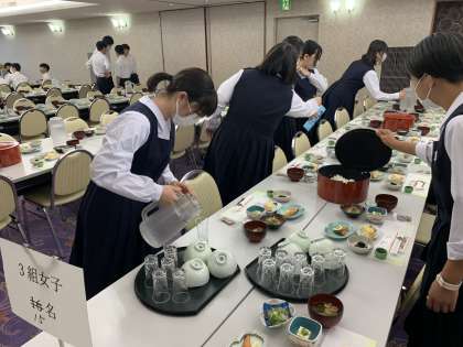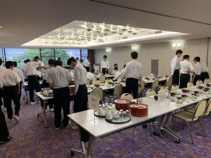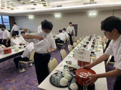 朝食会場に生徒が集まってきました。早く来た人が準備をしていました。