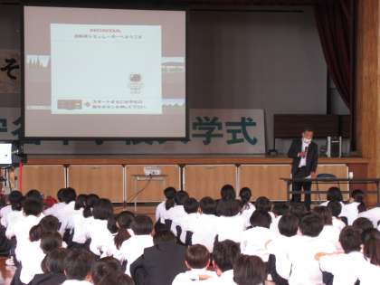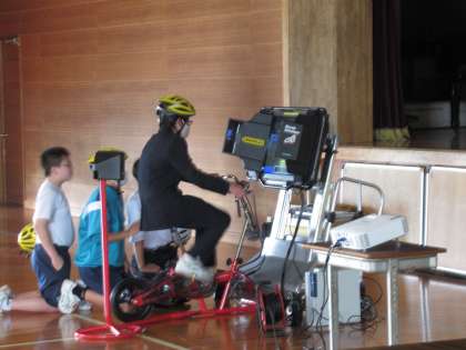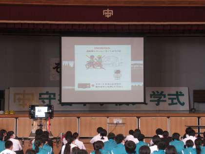 2、3時間目に交通安全教室を行いました。講義を聴いた後代表生徒がシミュレーターを体験しました。