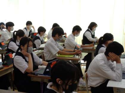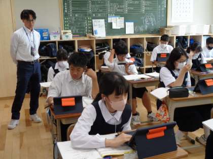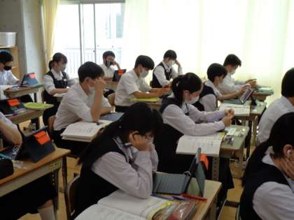3年生の英語の授業は、リーディング練習。タブレットを使って、各自練習していました。
