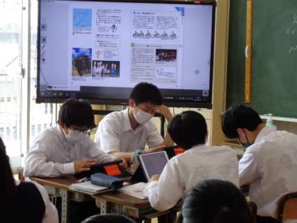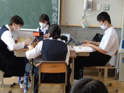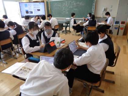 3年生の家庭科の授業は、幼児教育について。班毎に意見を出し合っていました。