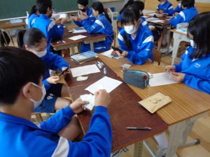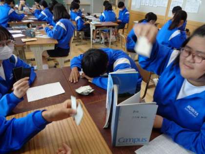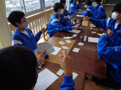 3年生の数学の授業。平方根のカードで、まとめ学習。ゲームを兼ねた確認です。