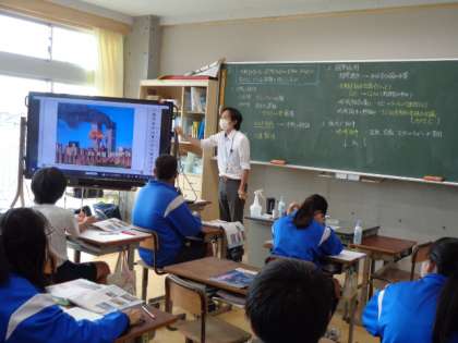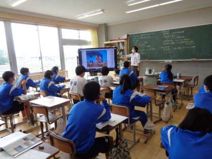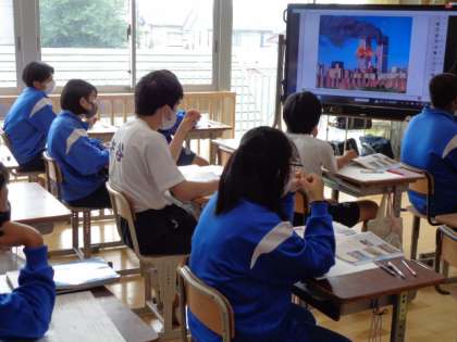 3年生の社会の授業は、国際社会について。冷戦時代や、同時多発テロについての先生の解説を真剣に聞いていました。