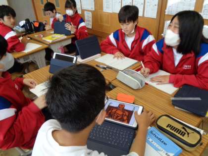 1年生の国語の授業は、説明文について。ポケモンを題材にレポートを作成し、友達に発表していきます。皆意欲的に活動していました。
