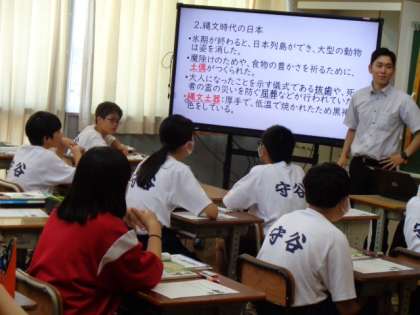1年生の社会の授業は、縄文文化について。先生の解説を真剣に聞いていました。
