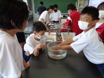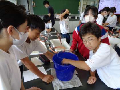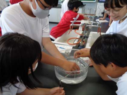 1年生の理科の授業は、気体の性質について。水上置換法によって、酸素を集めていました。各班で協力し合って進めていました。