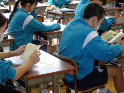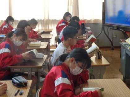 1・2年生は、静かに朝読書をしていました。3年生は学年集会をしていました。