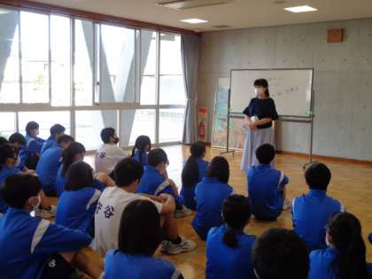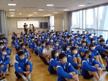 3年生は、朝の時間にコミュニティールームで学年集会。体育祭ウイークになり、今一度気持ちを引き締め、一致団結するための集会です。学年主任の座間先生は、「一生懸命頑張ることは、かっこいいことだ」、「reach out to the 北極星」という言葉を使って、生徒に気持ちを伝えました。いい体育祭になると確信しました。