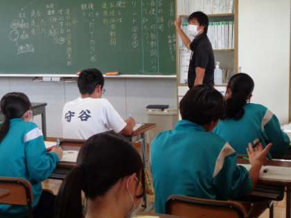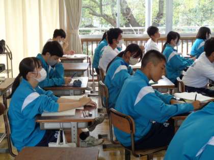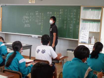 2年生の国語の授業は、用言活用について。プリントを用いて先生の解説をまとめていました。