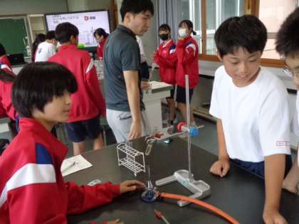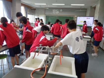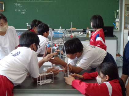 1年生の理科の授業は、みりんの蒸留実験。皆協力し合いながら進めていました。