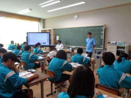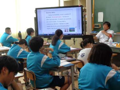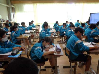 2年生の英語の授業。教科書本文のリスニングを行っていました。一つ一つの文の解説を、真剣に聞いていました。