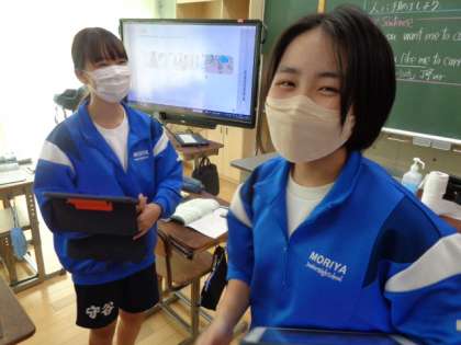 3年生の英語の授業は、会話文。ペアになって、スピーキング練習を行っていました。