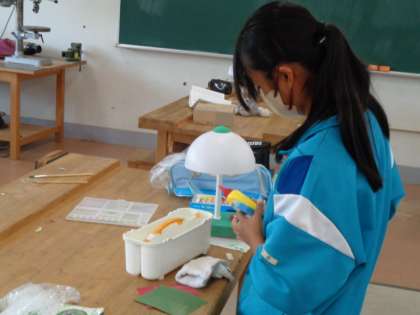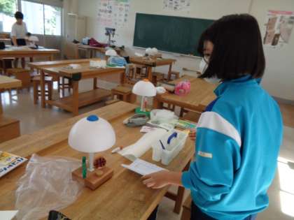 2年生の技術の授業は、LEDドームライト作り。仕上げもそろそろ終わりです。素敵な作品ばかりです。