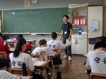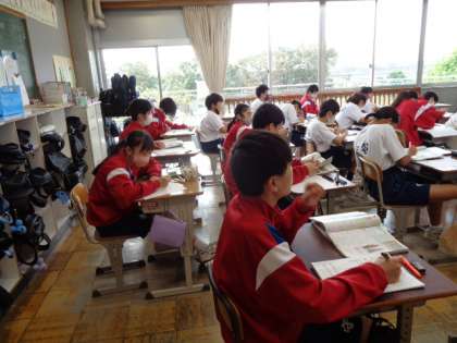 1年生の社会の授業は、仏教文化について。先生の説明を真剣に聞いていました。