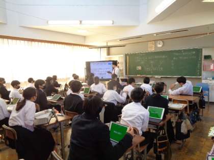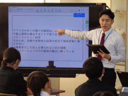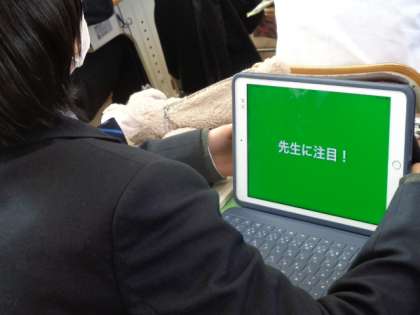 1年生の社会の授業は、アフリカ州について。アフリカ州への国際的支援について考えてまとめていましたが、差遠征の操作で、全タブレットの画面に、「先生に注目!」という注意文が出ました。まとめる際のグッドモデルについてのアドバイスをするための、中断でした。先生の解説を真剣に聞いていました。