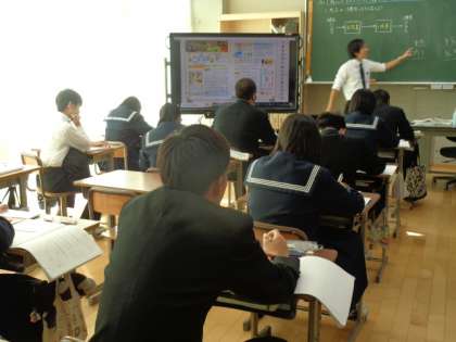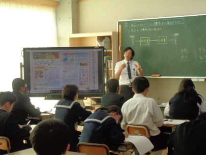 3年生の社会の授業は、商品の流通について。先生の解説を真剣に聞いていました。