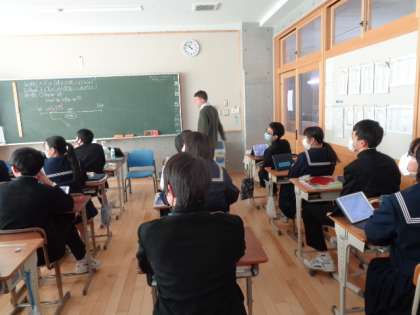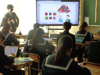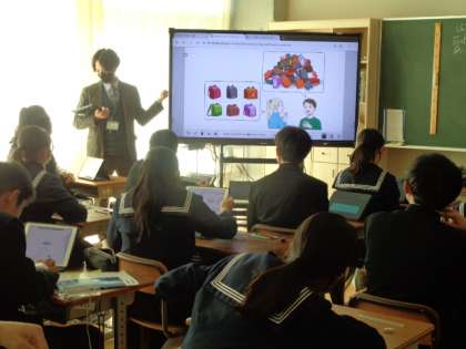 3年生の英語の授業。デジタル教科書のイラストを見ながら進めていました。