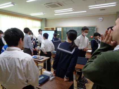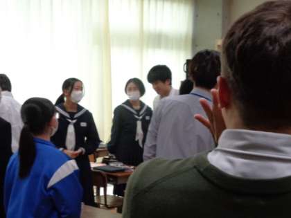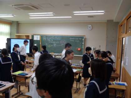 3年生の英語の授業。席を立って、近くの人と会話文の練習です。