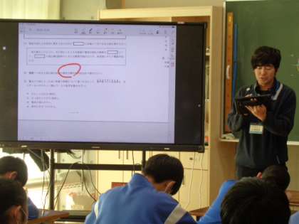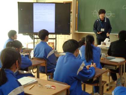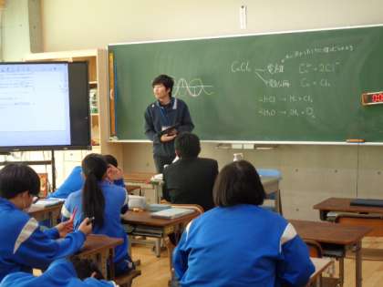 3年生の理科の授業は、化学変化に関する問題への取組。化学反応式や電離式について、間違いやすいところの確認をしていました。