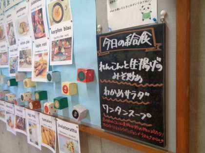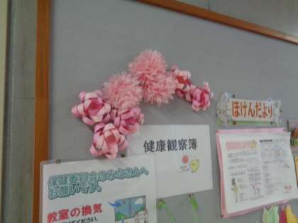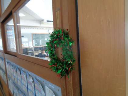 栄養教諭の柳田先生が毎日書いてくださる献立。小さな黒板に専用のマーカーで書かれている献立を見ると、スタバーである私は、すぐにスタバを思い出し、ホッコリしてしまいます。養護教諭の中村先生が、定期的に掲示物を貼っている保健室前の掲示版の花飾りを見ると、ピンクの柔らかい感覚が伝わり、心が柔らかくなります。また、1年生の各教室のドア付近に飾られているクリスマスリース。クリスマスでの、温かな人とのふれあいを想起させてくれます。