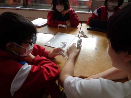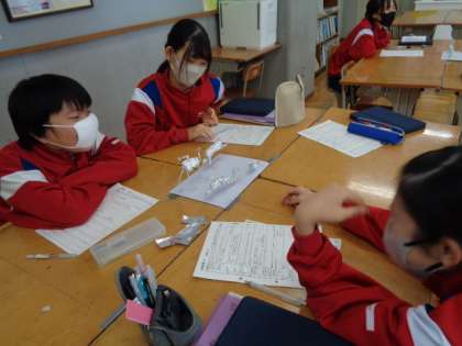 1年生の美術の授業は、造形。班毎に作品の見合いをしていました。