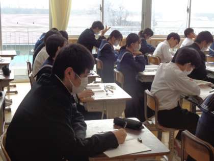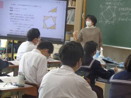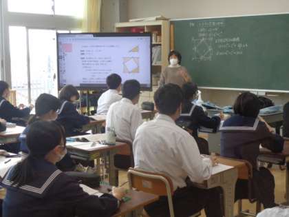 3年生の数学の授業は、三平方の定理。例題の解法についての解説を真剣に聞いていました。