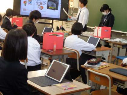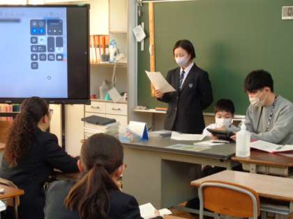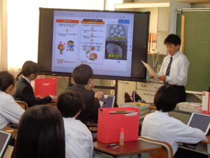 朝読書の後、保健委員会が電子黒板を使って、感染症対策についての注意点をクラスに伝えていました。