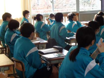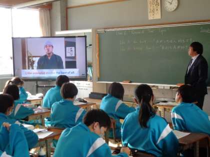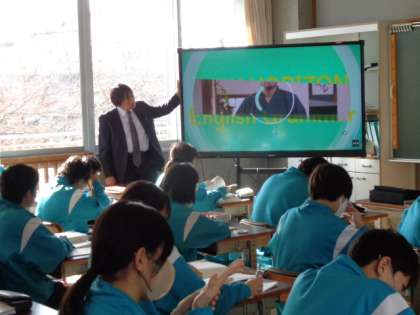 2年生の英語の授業は、比較級。先生の説明を聞きながら、動画で確認していました。