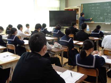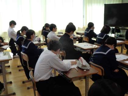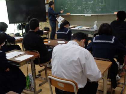 3年生の理科の授業は、テストの確認。先生の解説を真剣に聞いていました。