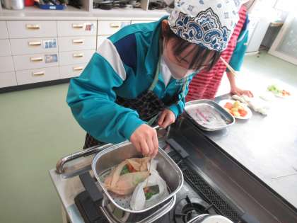 おいしい蒸し野菜が完成しました。彩りよく盛り付け、試食タイムです。