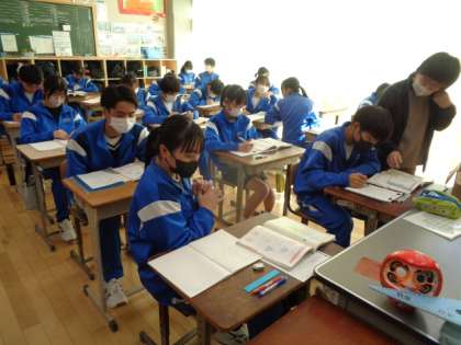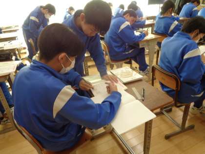 3年生の数学の授業は、図形問題への取組。教え合いながら進めていました。
