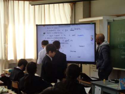 1年生の英語の授業は、基本文の確認。電子黒板を使って、穴埋め問題にチャレンジしていました。